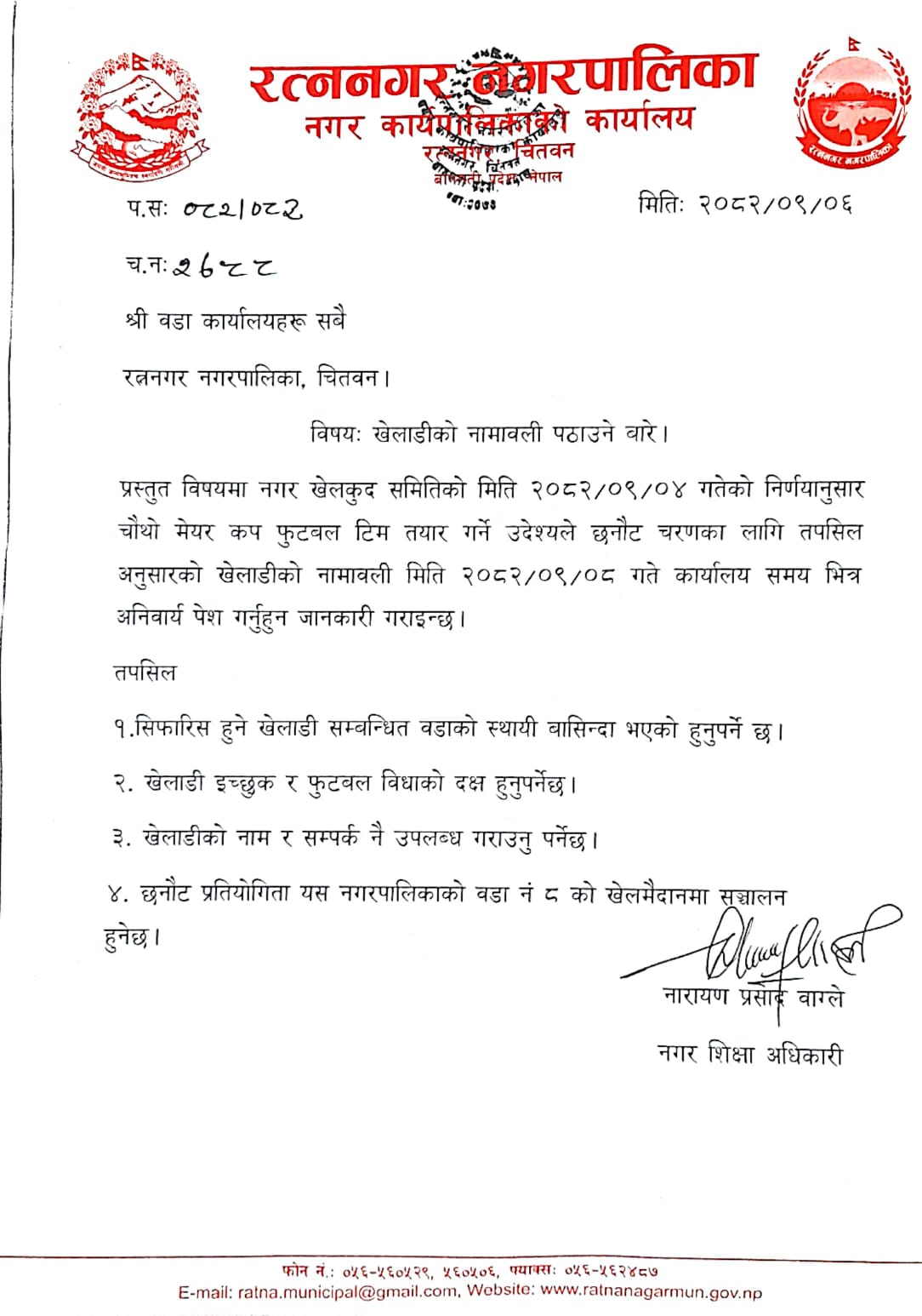 खेलाडीको नामावली पठाउने बारे । श्री वडा कार्यालय सबै (१-१६)