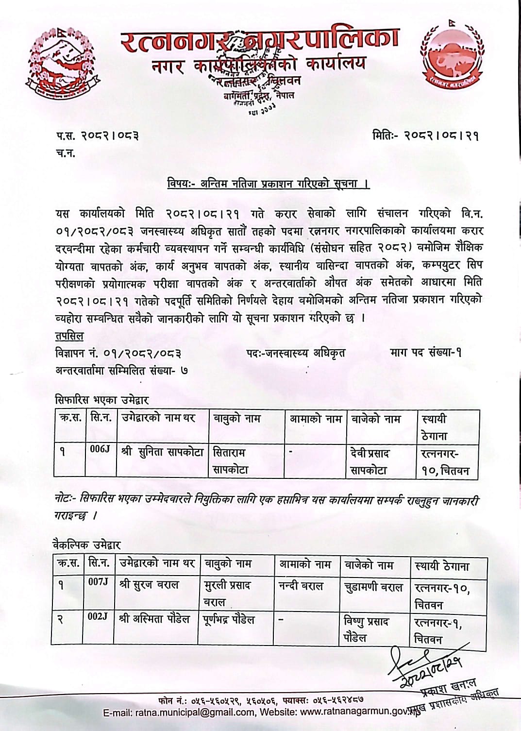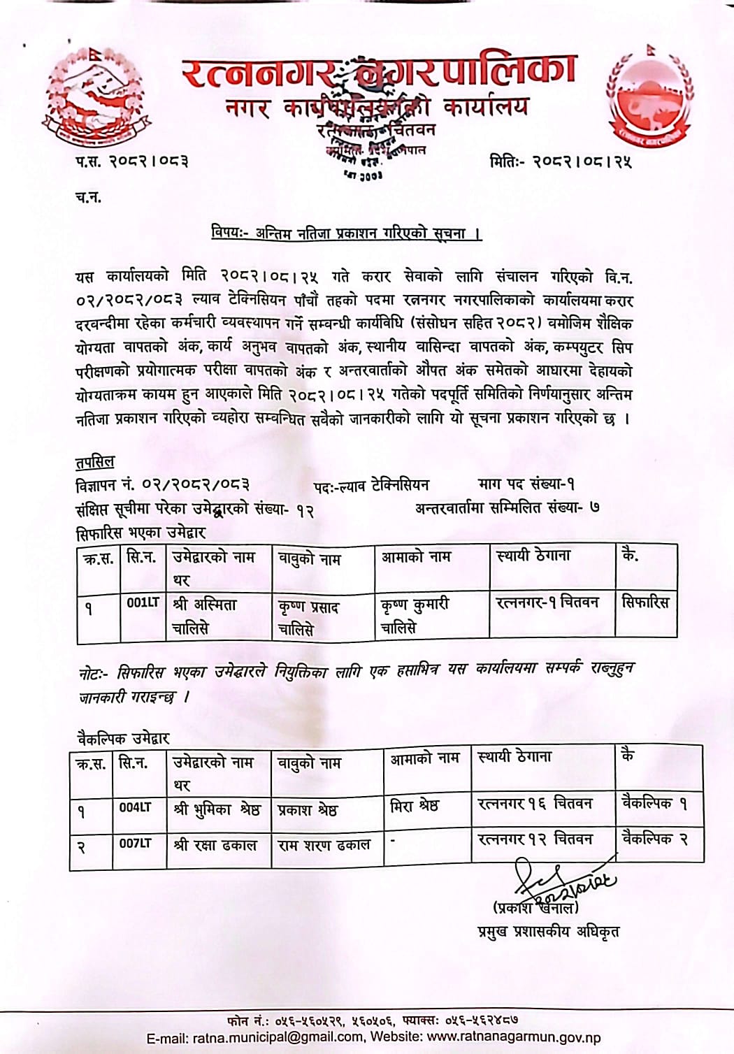 दरखास्त स्वीकृत गरी संक्षिप्त सूची प्रकाशन गरिएको सूचना ।