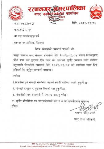 खेलाडीको नामावली पठाउने बारे । श्री वडा कार्यालय सबै (१-१६)