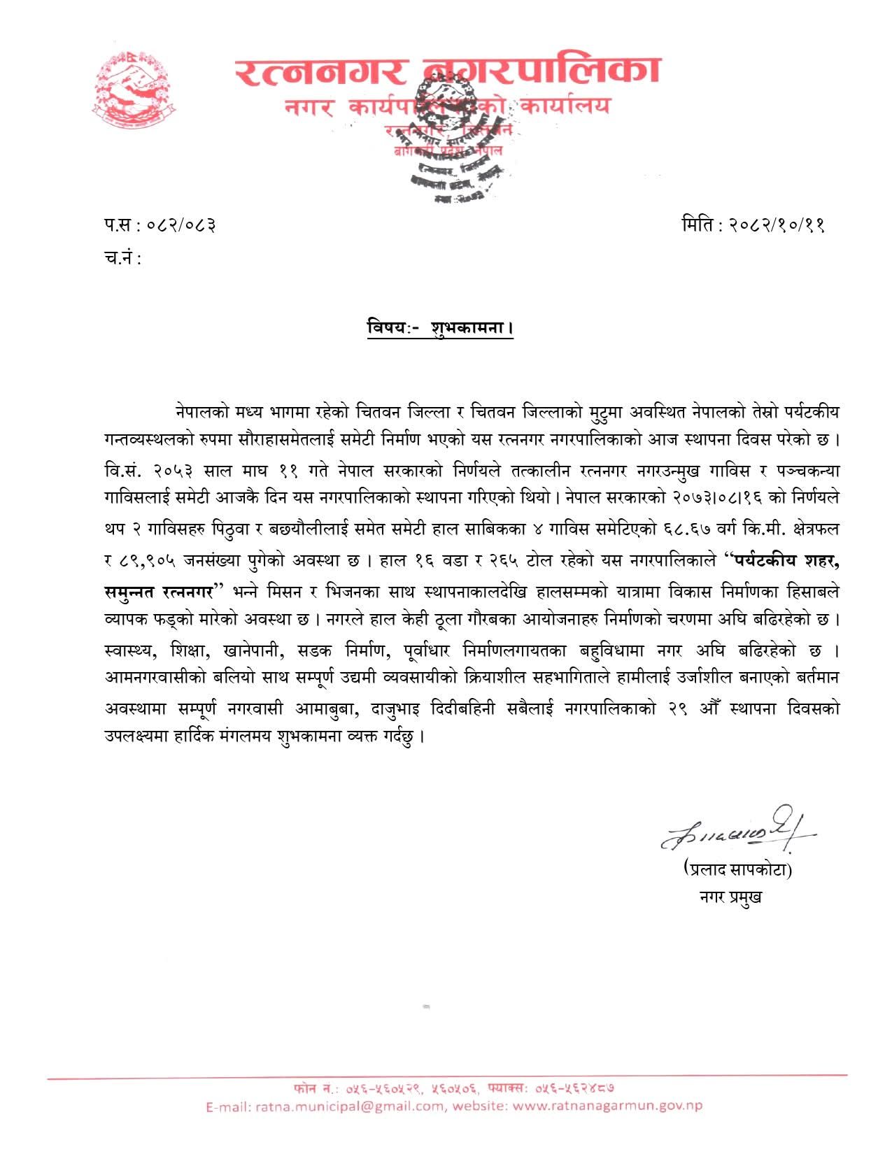 रत्ननगर नगरपालिकाको २९औँ स्थापना दिवसको उपलक्ष्यमा हार्दिक मंगलमय शुभकामना ।